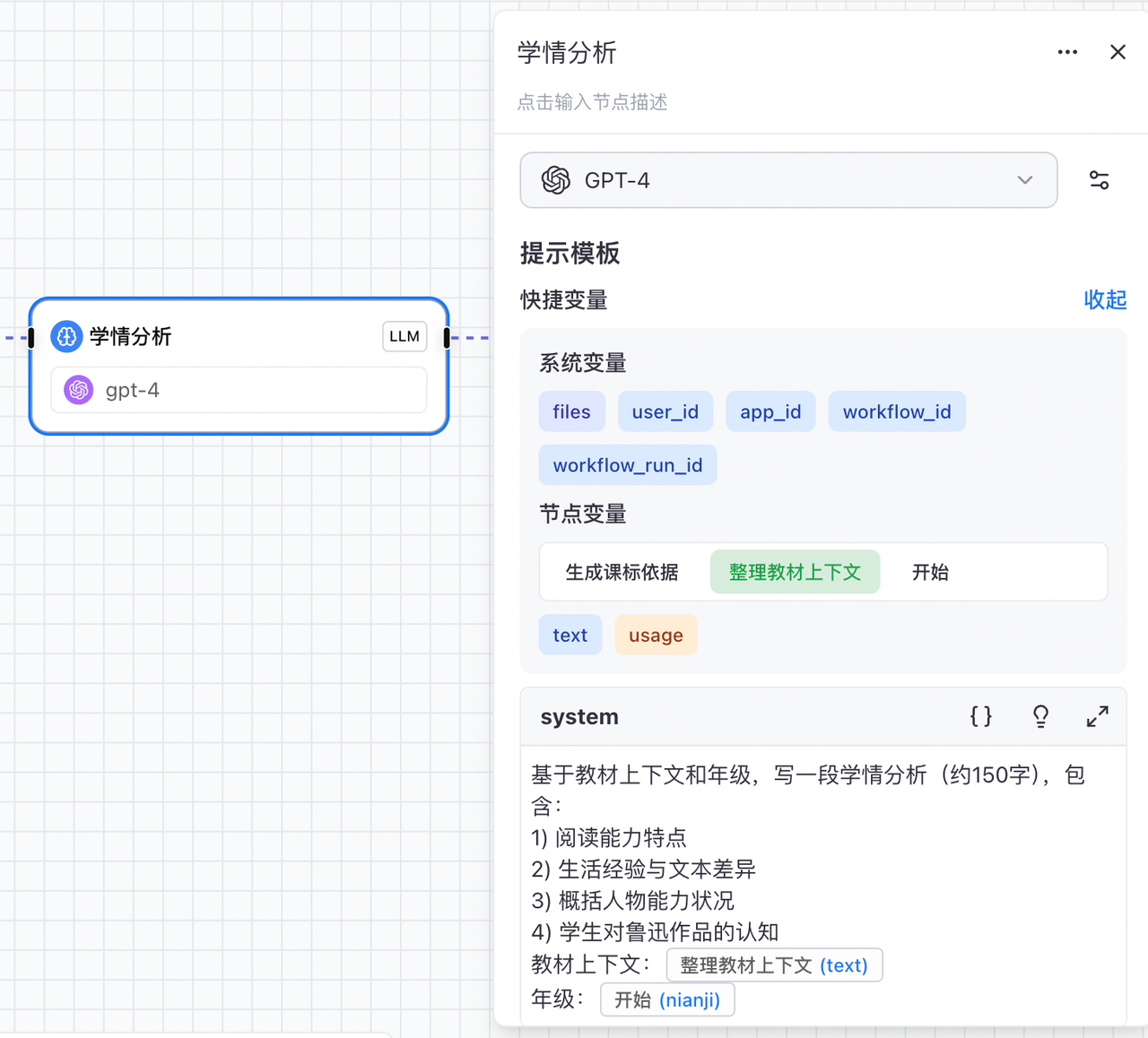 年级:开始(nianji)依赖开始节点输入的 年级 和 节点1 整理的 教材上下文 。