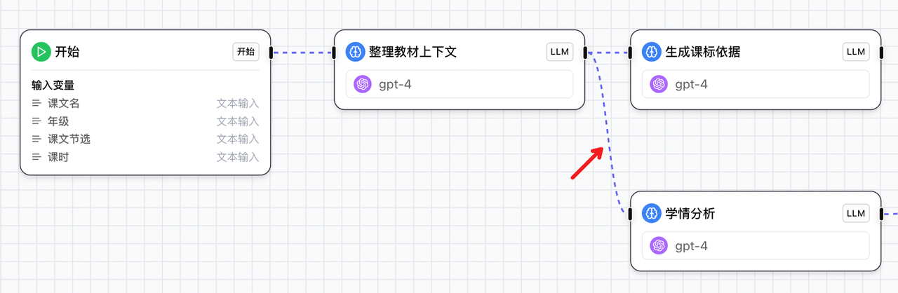 因为学情分析节点不依赖 节点2 课标依据的输出,因此我们可以让这两个节点并列,提高点运行速度。